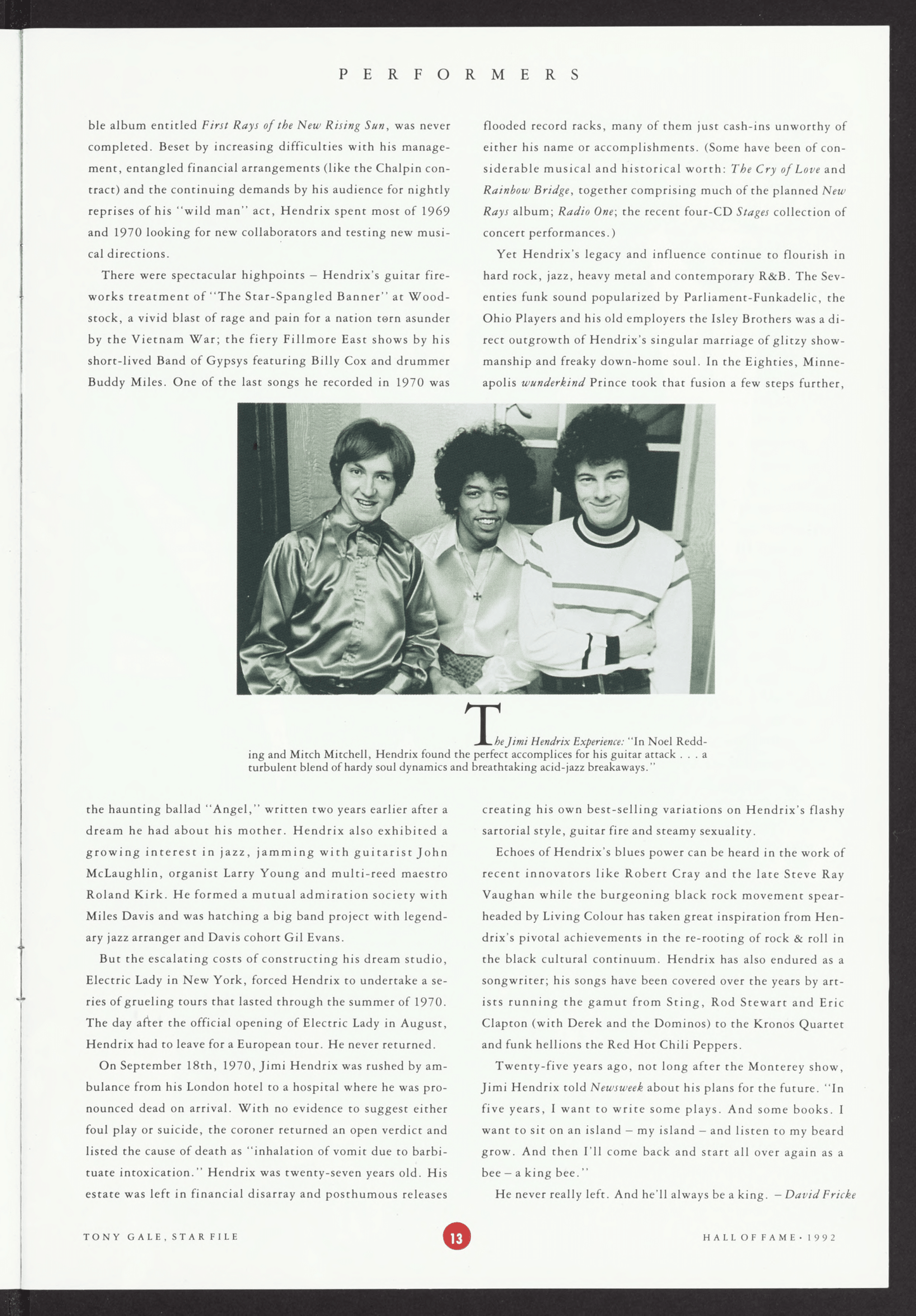 La Clase de 1992 del Salón de la Fama del Rock & Roll honró a un grupo diverso de artistas influyentes y figuras de la industria. Entre los artistas incluidos se encontraban Johnny Cash, reconocido por su profundo impacto en la música country y el rock; Jimi Hendrix Experience, conocidos por su innovador trabajo con la guitarra y su sonido psicodélico; los Isley Brothers, cuyas dinámicas contribuciones al R&B y al funk se extendieron durante décadas; Booker T. & the MG's, pioneros del soul instrumental; y el dúo vocal Sam & Dave, famosos por sus enérgicas interpretaciones de soul. The Yardbirds también fueron incluidos, reconocidos por su papel en la formación del blues-rock y el lanzamiento de las carreras de guitarristas legendarios. En la categoría de Influencias Tempranas, el guitarrista de blues Elmore James y el pianista de Nueva Orleans Professor Longhair fueron homenajeados por sus contribuciones fundamentales al rock and roll. El Premio Ahmet Ertegun se entregó al compositor Doc Pomus, al promotor de conciertos Bill Graham y al innovador guitarrista Leo Fender, en reconocimiento a su importante impacto en la industria musical.
